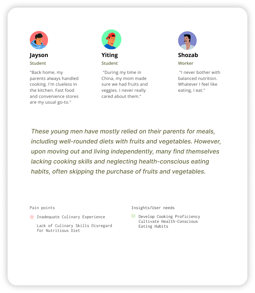 The survey questionnaire gathered personal information from respondents such as their cultural background and eating habits. Interviews revealed deep understanding of the young men's attitudes and their pain points about diet management.