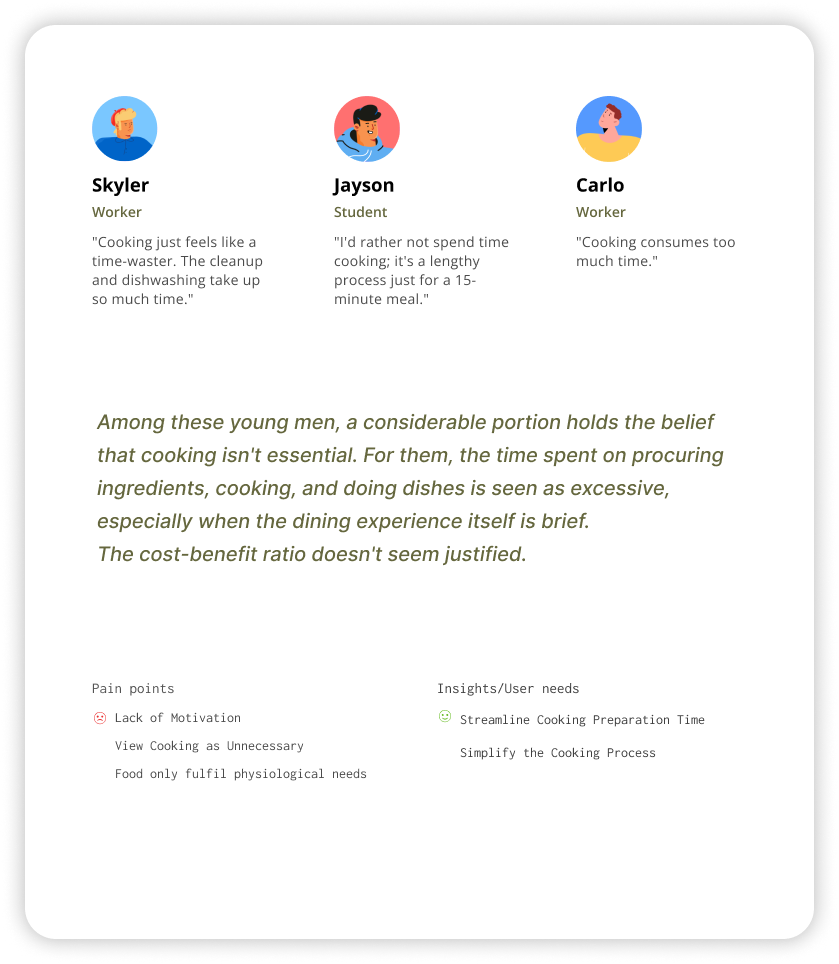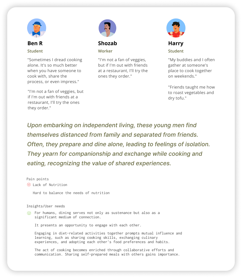 Based on our research, we have found that many young men lack the time to prepare and enjoy meals. In addressing this issue, the leisure time outside of work and studies provides a good opportunity for young men to step into the kitchen. During this time, they have the chance to cook and indulge in a good meal. As for motivation, social gatherings with friends serve as an incentive for young men to cook and have a satisfying meal. If there is a place available to them at any time, suitable for gatherings, cooking, and dining, along with provisions for ingredient preparation and cleaning services, this would solve the issues of kitchen access and the time-consuming nature of cooking. Young men would be willing to use their leisure time to cook, enjoy their meals, and even exchange culinary and dining experiences with friends. We recognize that the internet serves as a great medium for locating individuals who possess suitable kitchens meeting these criteria and are willing to share them.